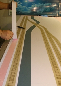 | Step 8: If you permanently glued the print in place you can skip this step and the rest of the steps and simply lay your roadbed directly over the template and glue in place with white glue, carpenters yellow glue or foam compatible caulking like Locktite PL 300. If you applied your print directly to your baseboard you can now cut out the roadbed area with a sharp hobby knife or retractable blade knife. For best results use a straightedge on the straight sections and carefully freehand the curved and turnout section. If you have applied the print to a sub-roadbed material such as plywood or homasote you can easily cut your sub-roadbed pieces with a jigsaw or router using the print as your guide. The sub-roadbed lines were not printed on this pattern as it is a flat shelf diorama and the foamboard base acts as the sub-roadbed. | |||